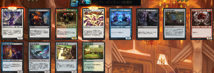 白の除去をピック。青のレア、青白の蜘蛛、など悩んで糸投げがあって使うかもしれない青レアをピック