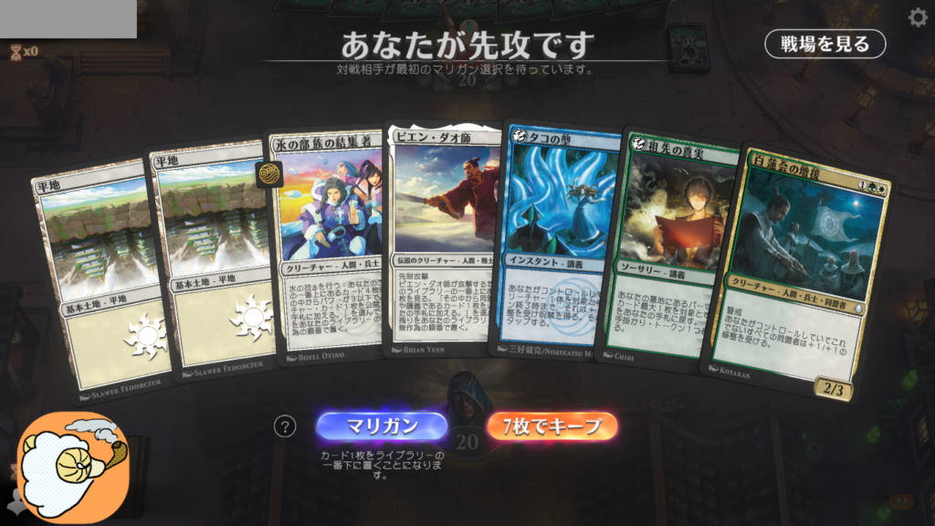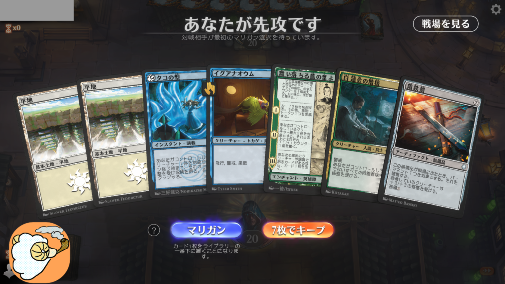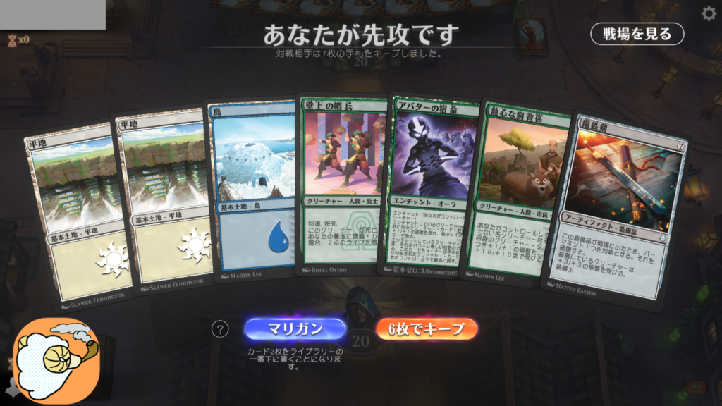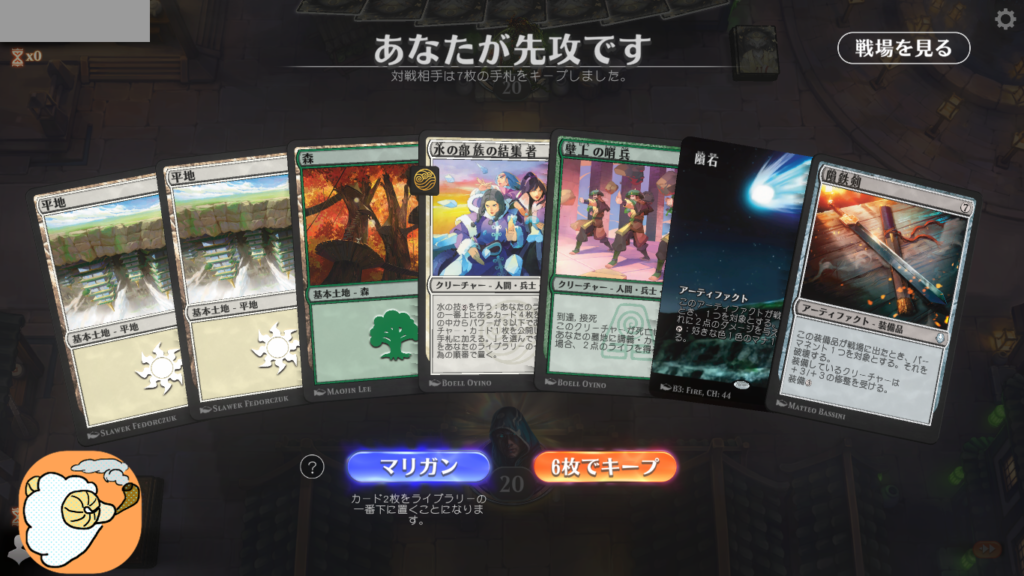 1戦目 土地がかみ合わずマリガン1 重い装備品を戻して6枚スタート