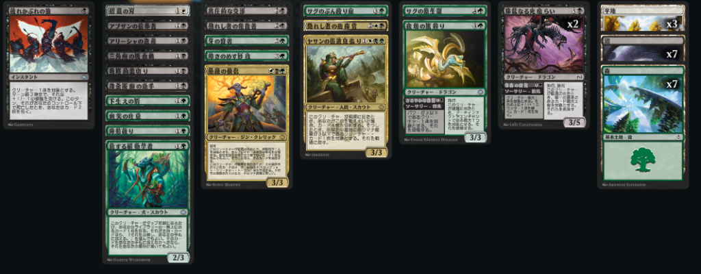 メインは2色でまとまってて、緑で土地をサーチできるカードもあるのでマナベースはしっかり出来ていそう。