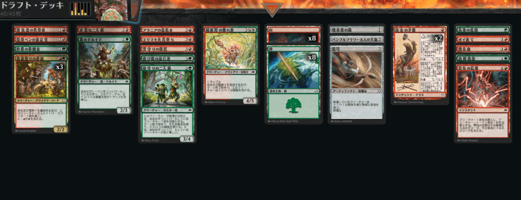 最終的に《放浪語りの導師》を3枚拾ったので赤緑は確定で、白を入れるかどうかですね