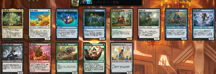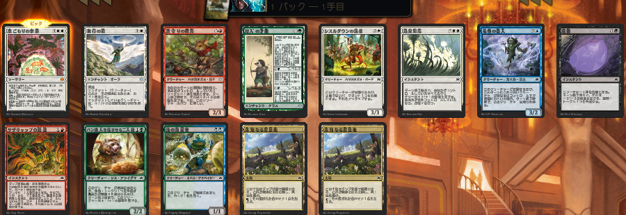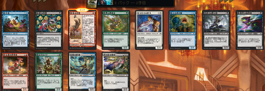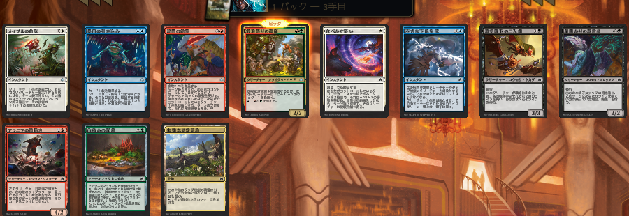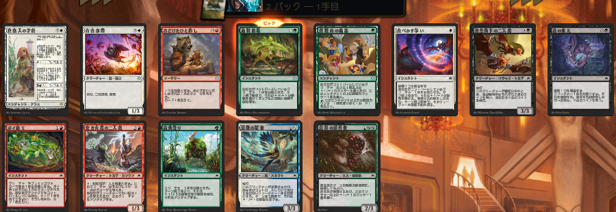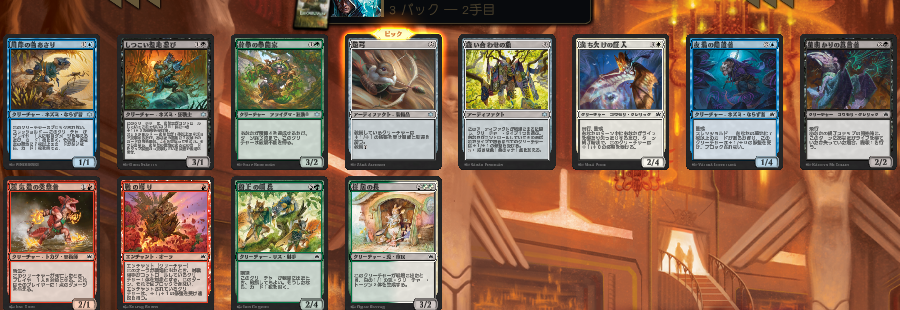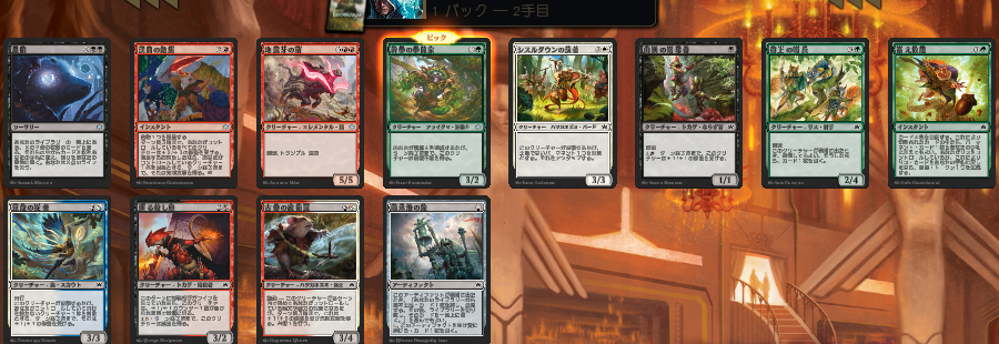 2パック目は緑、赤メインに白の強いカードがあれば一応ピックしました