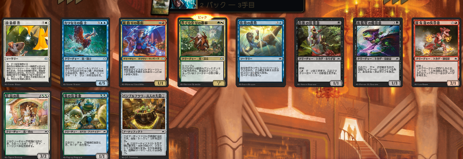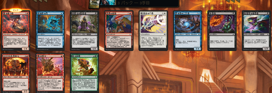 ここは白アンコモンの鳥、赤アンコモンの除去などが選択肢でしたが、押し込むのにも守るのにも使えそうな緑のコンバットトリックをピック